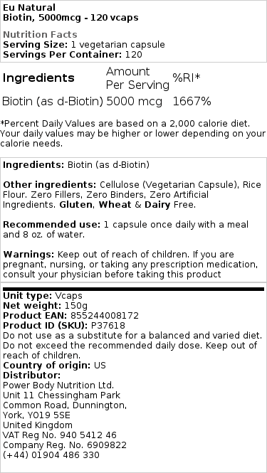 BIOTIN 5000 mcg fra Eu Natural er din naturlige løsning for at fremme længere hår, stærkere negle og mere strålende hud. Vores formel indeholder ren Biotin af høj kvalitet for at understøtte dit smukke udseende.